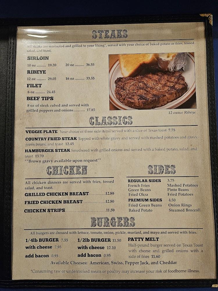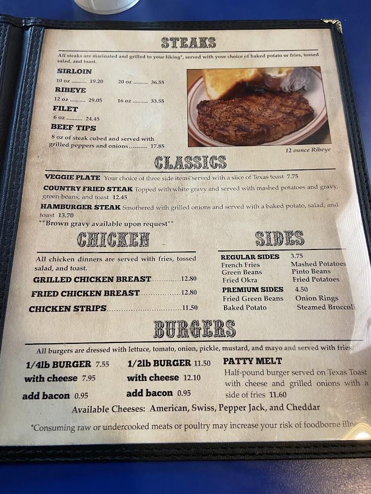 The restaurant offers a range of burgers, sandwiches, and salads. Signature items like the ribeye steak and chicken strips feature prominently on the menu. Desserts like chocolate and coconut pie add a sweet touch to any meal.