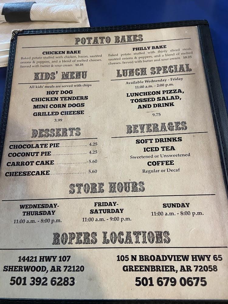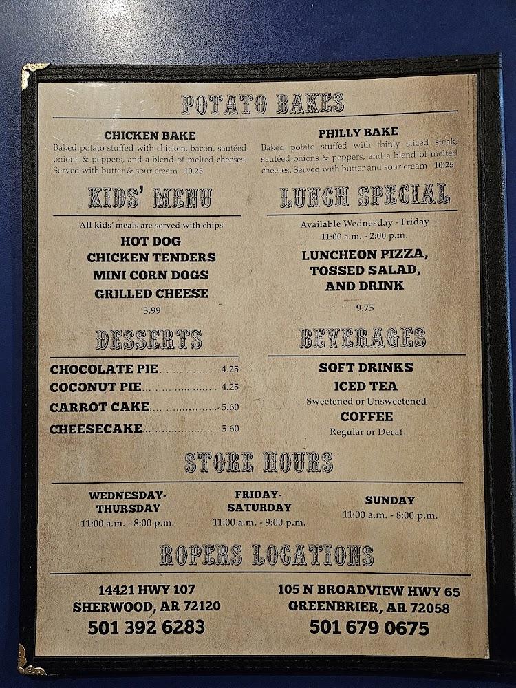 Welcome to Roper's Restaurant, a charming dining destination located at 1035 US-64, Beebe, AR. We specialize in American grill cuisine and delicious pizzas, catering to families, groups, and solo diners alike. Enjoy a relaxed atmosphere with an extensive tea selection and local specialties, perfect for lunch or dinner. Our accessible amenities ensure all guests feel welcome, including wheelchair access and family-friendly seating. Choose from dine-in, takeout, or fast delivery options, and don’t forget to indulge in our tempting desserts. Affordable pricing between $10 and $20 makes Roper's the ideal spot for a delightful meal. Join us today!
